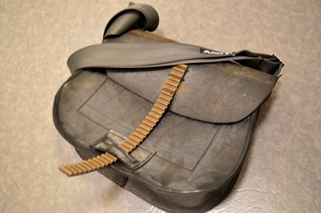 Axelremmen är tillverkad av ett gammalt bilbälte och ”låset” av en kamrem. Jag blev överförtjust då jag såg väskan direkt när vi kom in på mässan. Men jag köpte den först fyra timmar senare – efter att ha övervägt saken noga – strax innan vi skulle åka hem.