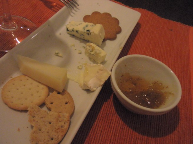 När vi sedan hade ätit klart, Guuben sin laxburgare och jag min Bellas burgare kom desserten in. Vi var så mätta att vi nöjde oss med att dela på en liten ostbricka.