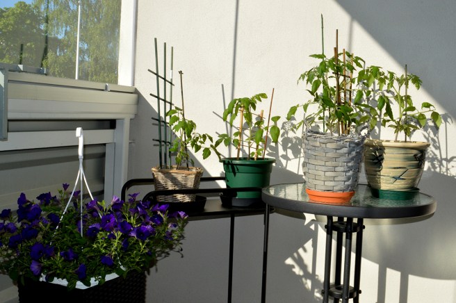 Det har tack och lov börjat blåsa, så tomatplantorna vajar i vinden då jag har öppnat fönsterglasen på balkongen.