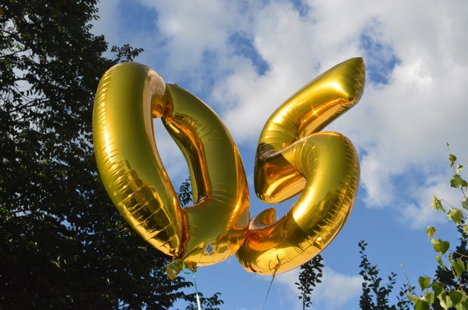 Symboliskt nog bildade ballongernas bakvända skuggbild ordet OS. Kvällens jubilar har vunnit medaljer i Paralympics på 1990-talet, så det här passade ju bra. Riktig guldvalör också!