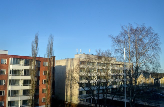 Utsikten från balkongen. Här sitter jag nog inte ännu på ett tag, det är för kallt och solen når inte hit förrän i april. Men blå himmel gör mig verkligen glad!