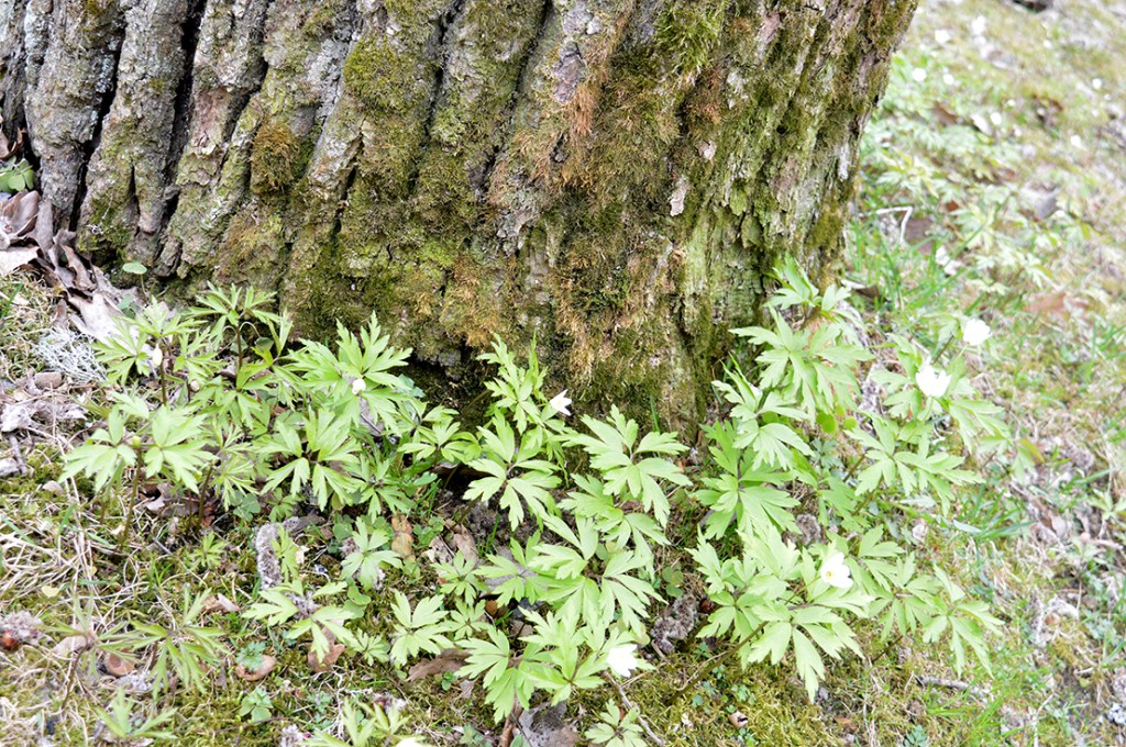 Den gamla stammen gläds varje gång som ny grönska dyker upp, på våren i form av vitsippor.