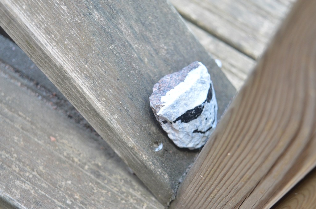 En av stenarna som jag har målat och gömt. Verkar nog ändå mest som en lottovinst att de ska rapporteras. Någon hittar dem säkert, men vad som sedan händer med stenen vet jag inte.