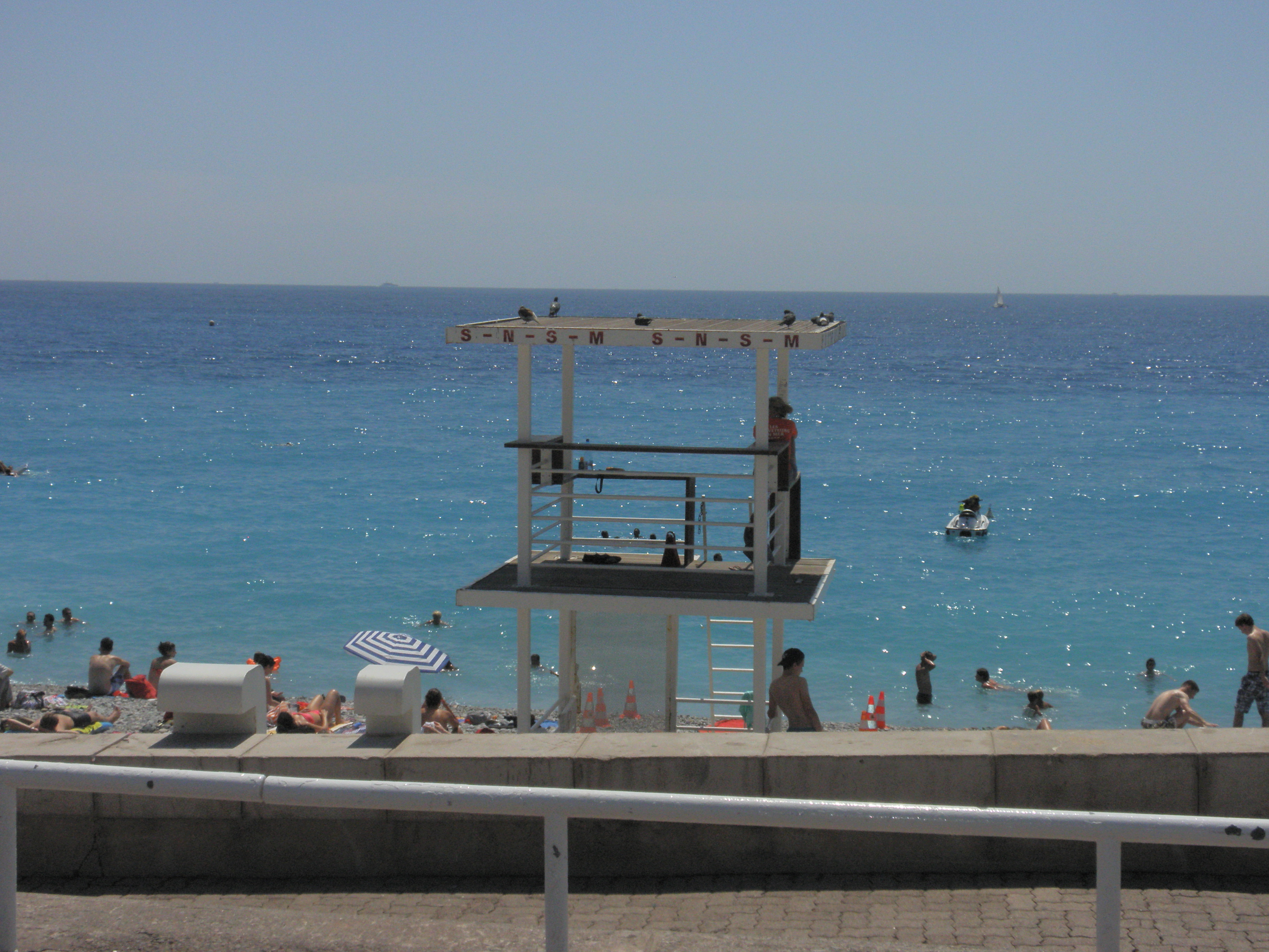 Livräddare, strandövervakare, badvakter – vad de nu må kallas, fanns både på betalstränderna och på gratisstränderna längs bulevarden i Nice. En del satt i torn, andra vid bord under parasoll vid strandkanten. Ibland promenerade de runt och hade för det mesta tillgång till surfbräde att paddla i väg med och vattenscooter.