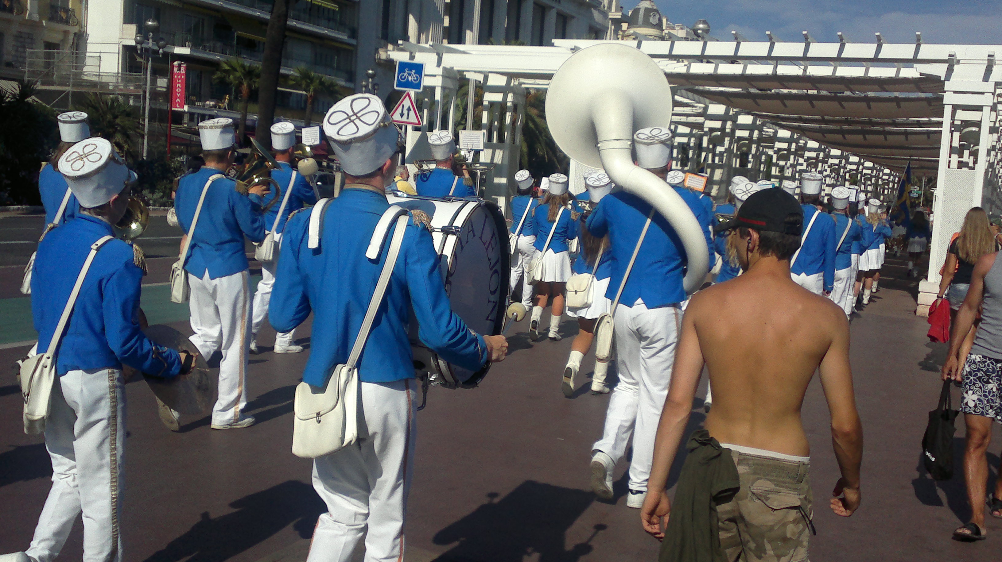 En eftermiddag uppträdde musikanter på strandpromenaden. Det var otroligt varmt hela veckan vi var i Nice, så jag avundas inte de uppträdandes kläder. Ensemblen spelade bland annat Lady Gagas ”Pokerface” och rev ner applåder till och med av gästerna som låg nere på stranden och inte såg allt som hände uppe på bulevarden.