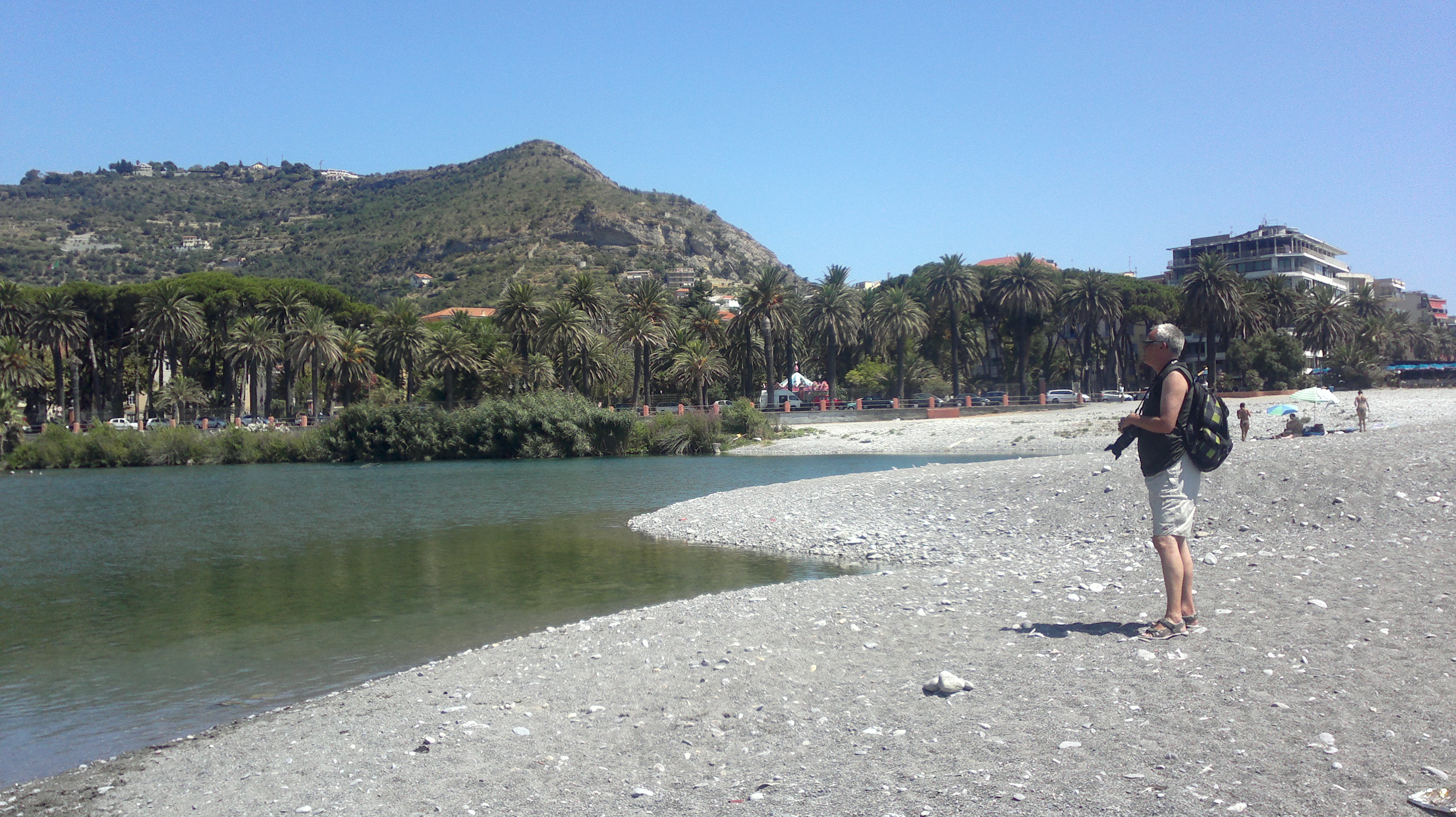 En fin och lugn strand i italienska Ventimiglia. Till vänster en lagun som bildats av havsvattnet. Havet ligger ungefär femtio meter till höger om bilden. I bakgrunden syns en park.