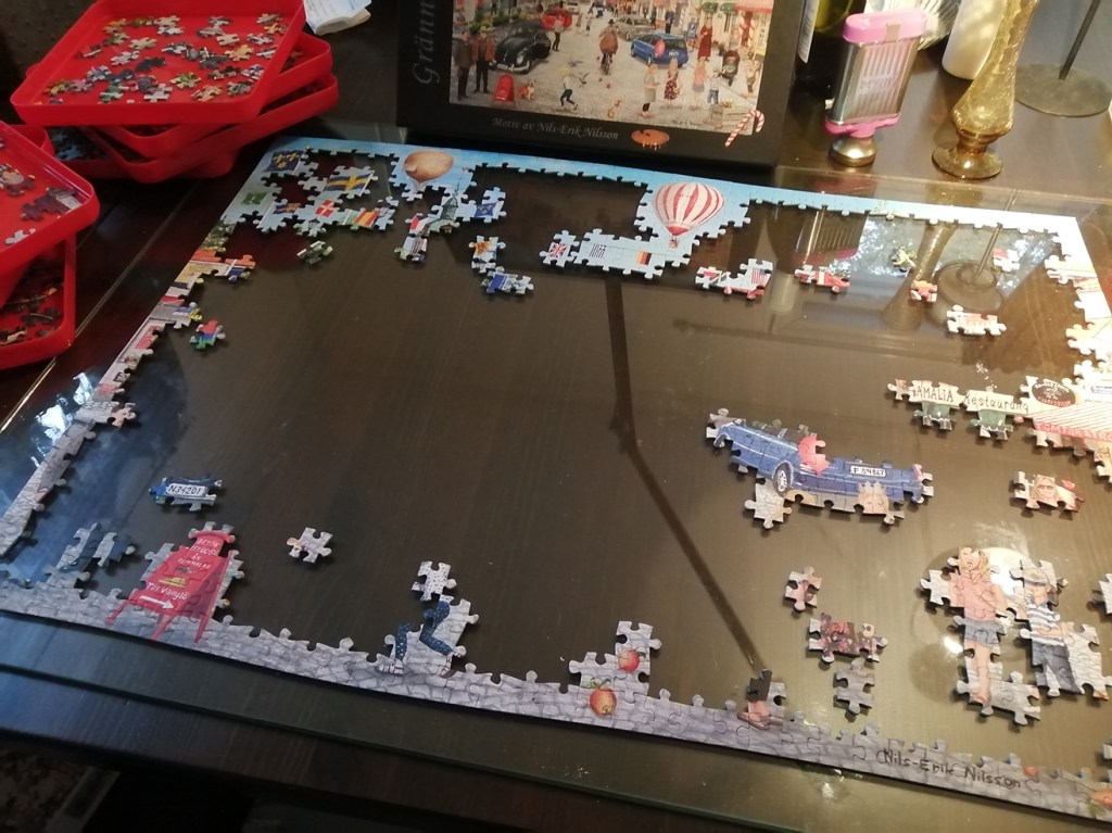 Pusselläget igår på eftermiddagen. Det är mycket roingivande att sortera bitar och att sedan se allt fler hitta sina platser. Tankarna kommer och går och att sitta här är på något sätt också terapeutiskt.