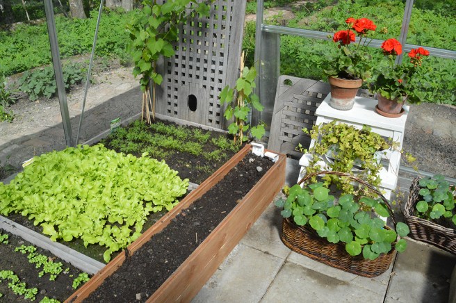 Här fanns stora växthus på gården förr. I år har maken i huset samlat tegelstenar från ett hus som ligger i närheten, och som bombades sönder på 1940-talet. Av skorstenens tegel har han byggt en gång, en del av den syns här. Ett sådant jobb att dels frakta stenarna, dels få dem snyggt på ny plats!