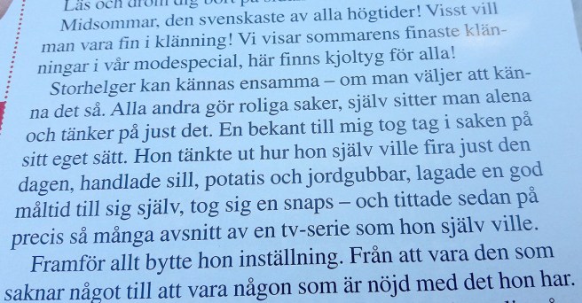 Jag har varit singel över tio år, bor ensam och har inga barn. Men på något sätt har jag vant mig och jag har min syster och ganska många vänner i mitt liv som jag umgås med ofta. Det som är festliga helger för andra, såsom nu midsommaren med vistelse på stugor och holmar med familjer och vänner – det blir mest vilodagar för mig. Jag sover länge och hämtar krafter för att orka i jobbet som ensamföretagare.