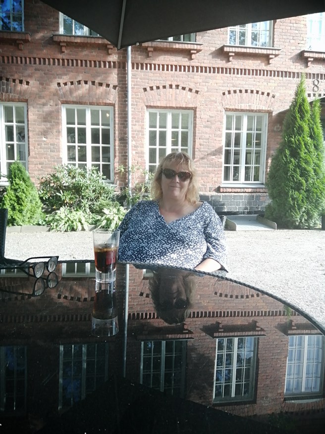 Jag tycker att den här bilden som min väninna Ann-Britt tog blev kul då jag och byggnaden speglas i bordet 🙂