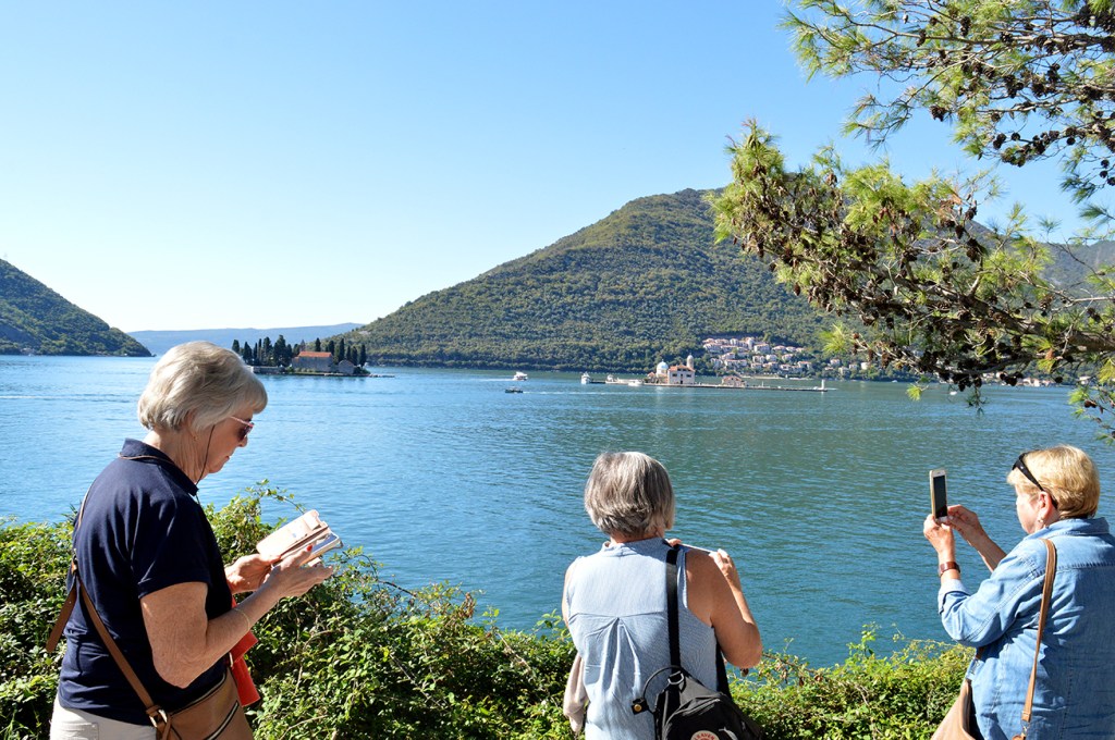 Några av resenärerna fotograferar öarna. Den till vänster har en kyrkogård och är stängd för turister. Till höger ligger Our Lady on the Rocks. Vi hade ju tur med vädret sju dagar av åtta.