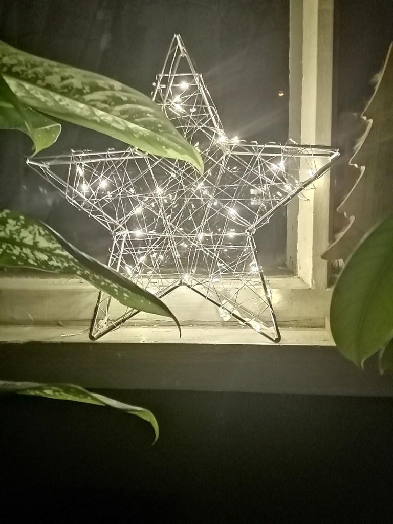 Jag är noga med att inte sätta adventsstaken i fönstret innan det faktiskt är advent. Julen smyger inte in är heller i förtid med tomtar eller andra prydnader. Men en enkel stjärna med vitt ljus får gärna ge mysbelysning om kvällarna när jag sitter vid datorn. Jag ser den också från tv-soffan 🙂