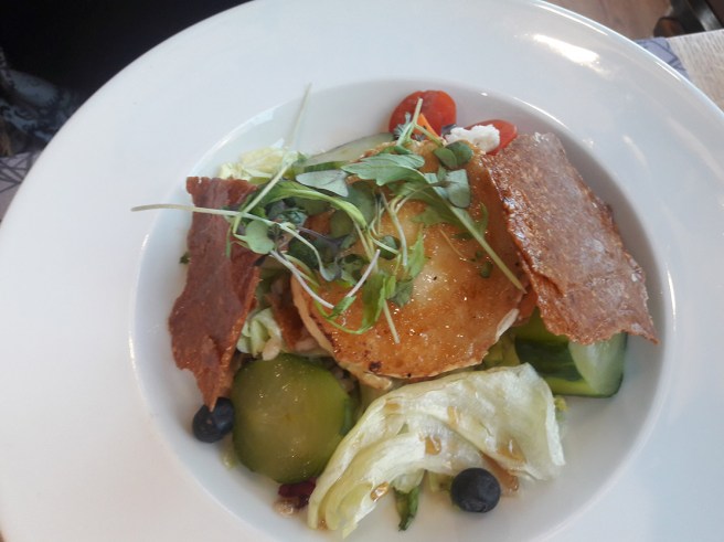 Min syster åt getostsallad med ett underbart krispigt bröd (det bruna på bägge sidorna av osten) som hade beströtts med sirap…