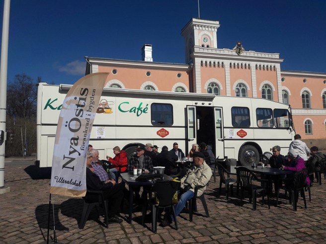 Solen sken över torget där Nya Östis firade sina tre verksamhetsår med kaffe och kaka.