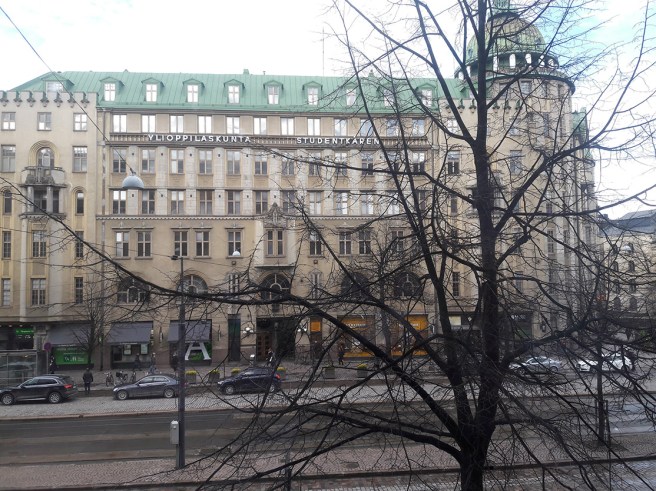 Den här utsikten över Mannerheimvägen och Studentkårens hus gillar jag – därför besöker jag Kaarna så ofta jag kan.