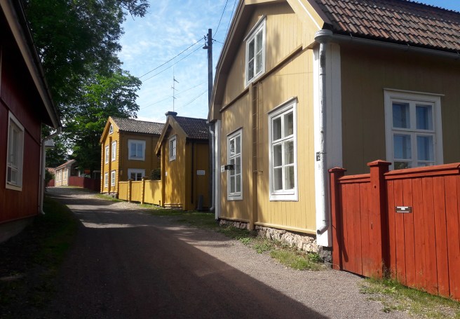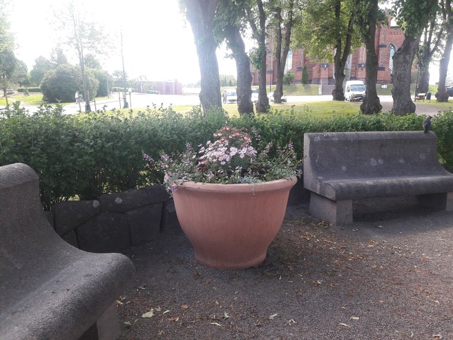 Gamla hus på Smedsgränd i Gamla stan.Paus på bänk i lummig park.Jättekruka i Kyrkoparken.