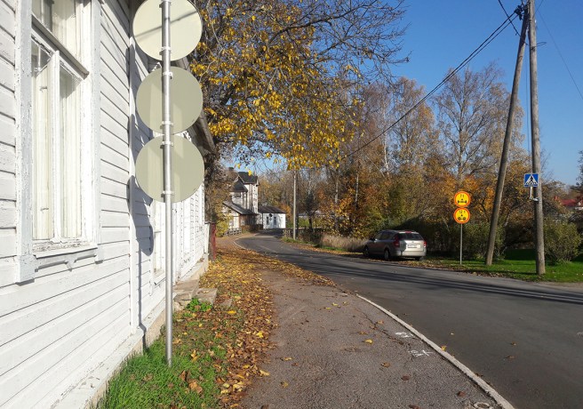Den här bilden tog jag faktiskt på Lovisadagen den 25 augusti, så det är snart en månad sedan. Men träden är fortfarande rätt gröna här och himlen är blå i dag, så därför passar skylten bra här. Den finns nere vid Lovisavikens strand.