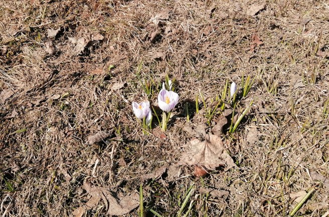 Bland en massa gamla fjolårslöv har krokusarna kämpat sig upp på vallen vid busstationen.