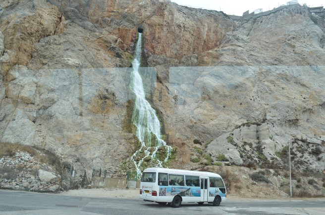 Stadsmiljö, fortfarande fotograferad via bussfönstret.Europas mest sydligt belägna moské finns på Gibraltar.Ett vattenfall sett genom minibussens fönster.Aporna vände mig ryggen och försvann förskräckta in bland träden.