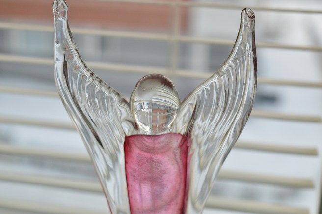 Men den här ljushållaren vann jag en gång och den står i köket, så mitt val föll slutligen på ängeln i glas.