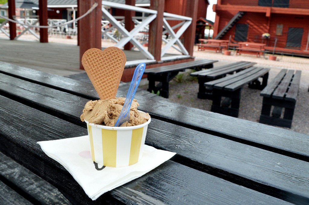 Sagt och gjort alltså! Iväg för att köpa glass! Nere vid stranden blåste en stark vind från sydost. Men skam den som ger sig. Glassen, smak apelsin-choklad, avnjöts!