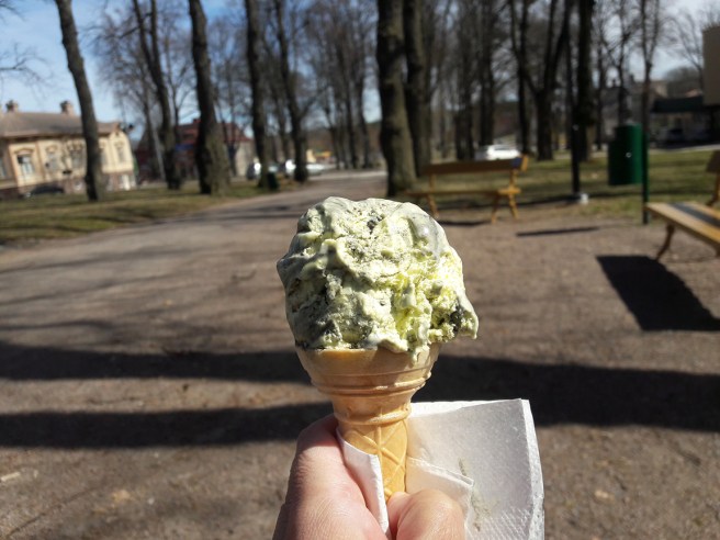 Jag avnjöt den i Ankarparken. Det blåste lite men +14 grader är precis lagom varmt. Det var rofyllt att sitta där och äta glassen, se på folk och bilar som for förbi, höra fåglarnas kvitter.
