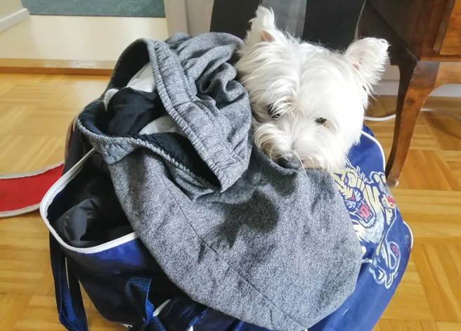 Väninnans hund ser ut att tänka ”bäst att man lägger sig i mattes kasse, annars kanske man blir bortglömd när det är dags att åka hem”.