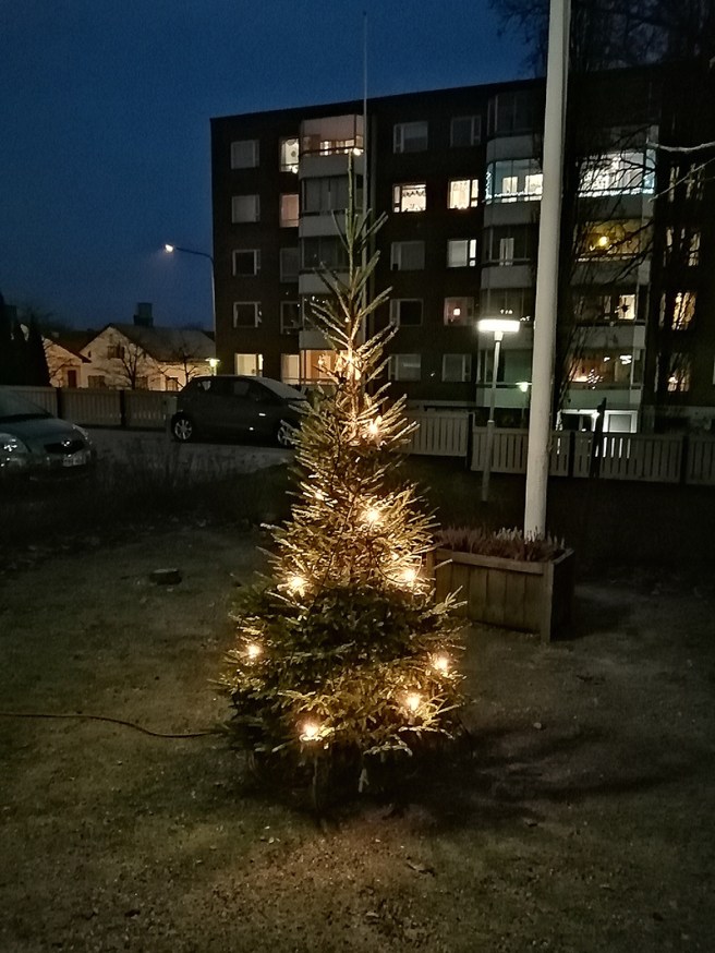 Det finns folk i vårt hus som ordnar både det ena och det andra. Jag vet inte ens vem som gör vad alla gånger. Ibland blomplanteringar, ibland något annat. En fin liten gran pryder åter gården och gör i alla fall mig glad. Jag är tacksam för att bo i just det här huset ❤