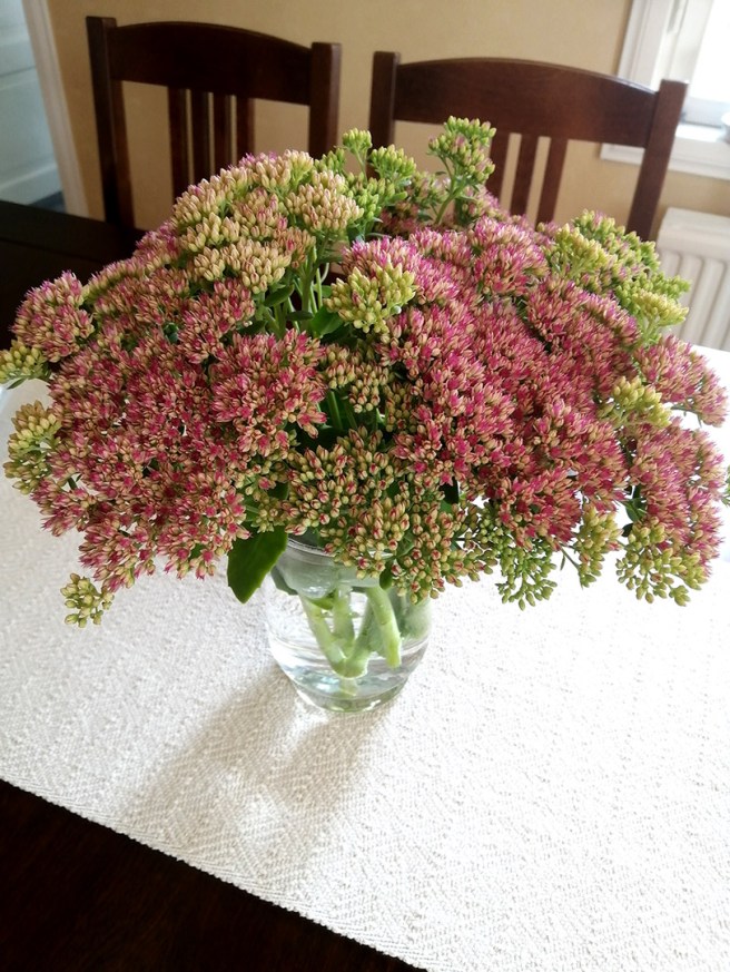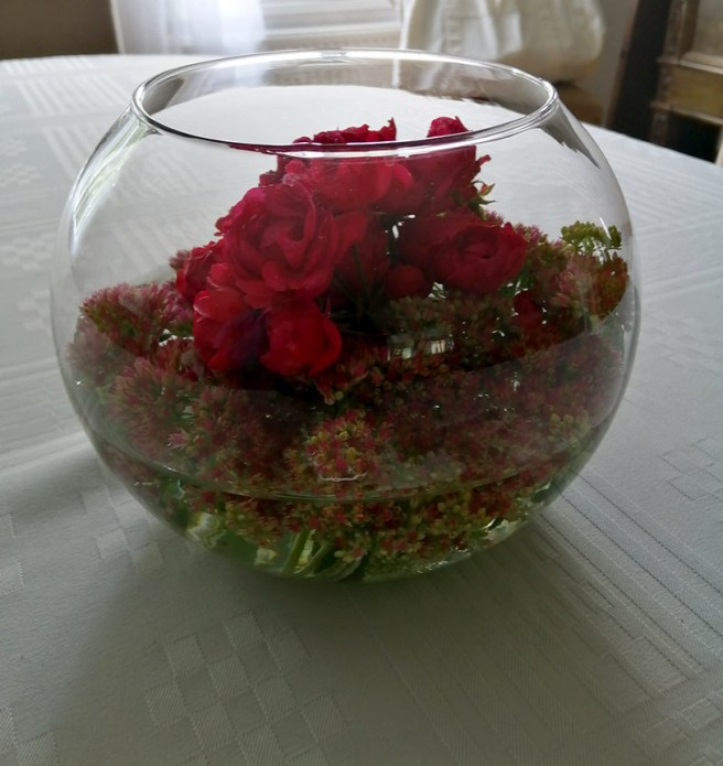 Jag kan fortsätta på Glad måndag-temat då jag visar två blomsterarrangemang som jag tog bilder av i fredags hos min massör. Hon ger nytt liv åt blommorna inomhus. Här har hon en glasskål med vatten i, kärleksörter på botten och röda blommor från rabatten på toppen.