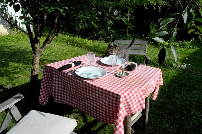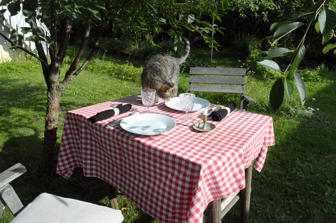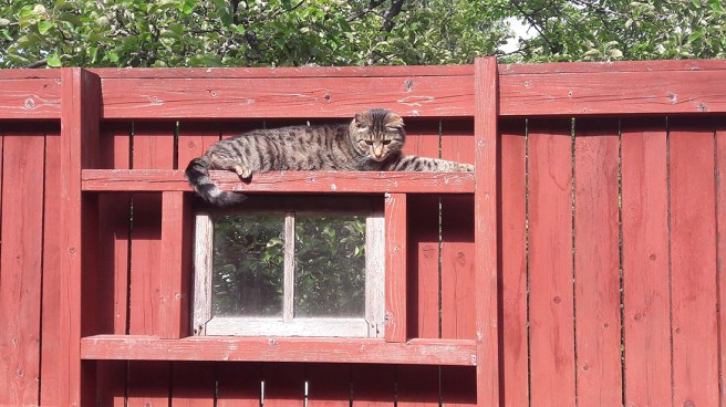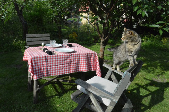 I parken rör sig nuförtiden också en katt. Den bor troligen i någon av granngårdarna och den har blivit flitigt fotograferad. Den verkar komma direkt som den ser människor röra sig trädgården. Och sedan kråmar den sig och låter sig välvilligt fotograferas.