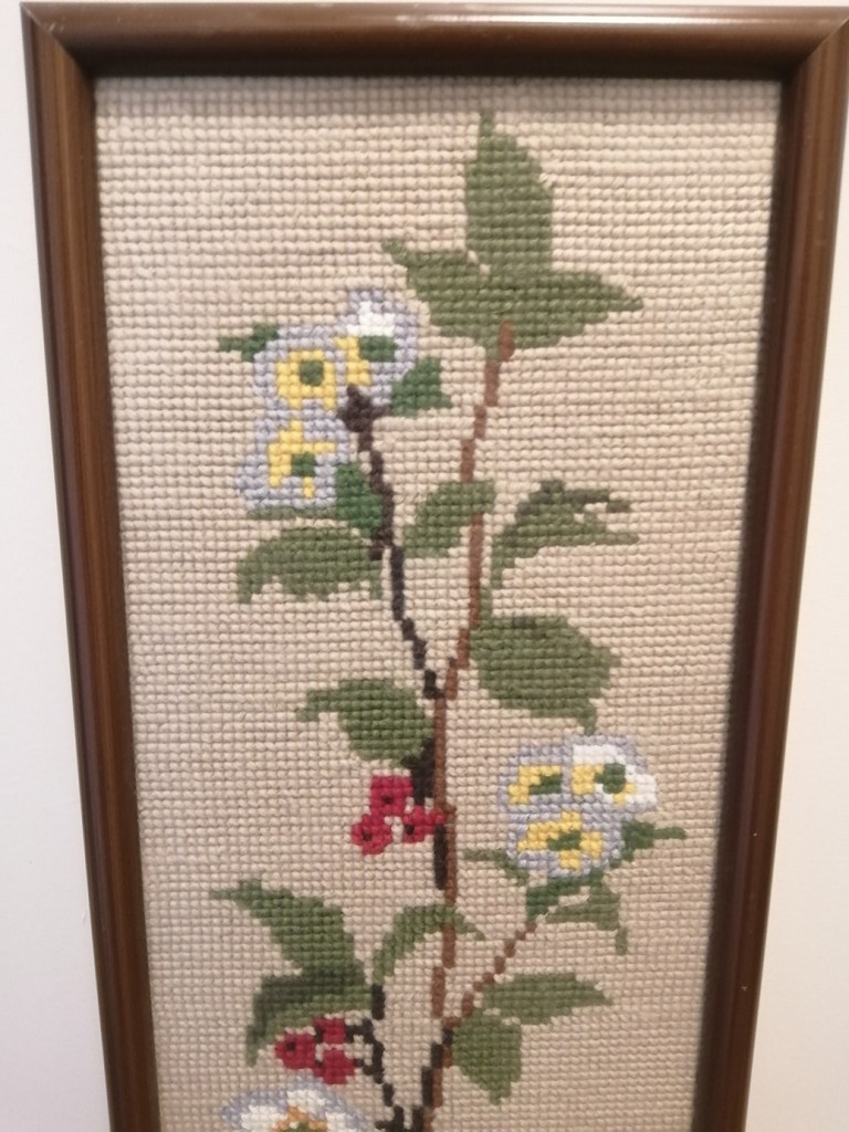Ordet i utmaningen Hoppa på tåget är denna vecka BRODERA. Jag har någon gång gjort det, i skolan då det hörde till i handarbetsundervisningen. Numera stickar jag inte, virkar inte, broderar inte. Men det är fint att det finns många andra som gör det, håller hantverken vid liv. Den här tavlan har min mamma gjort.