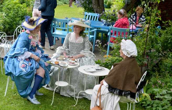 … kändes över Lovisa under veckoslutet. I söndags kom konung Adolf Fredrik och hans hovdamer på besök till Engströms trädgård. Evenemanget Konungen kommer har arrangerats under många år. Nu var jag själv inte där och tittade på uppvisningen men jag fick se damerna i sina fina kreationer då de kom på besök till granngården, Konungsdammens trädgård.