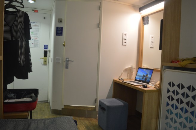 Vi hade en seaside lyxhytt med dubbelsäng, tv, barskåp med gratis innehåll och stort fönster som vette mot havet. Dessvärre låg den så att där ibland gick personal och passagerare förbi, och där fanns en krananläggning och några slags tunnor (?) i metall, så helt 100 procent seaside-view var det inte. Men resan som helhet var toppen och får tio plus. Till och med knäet funkade!