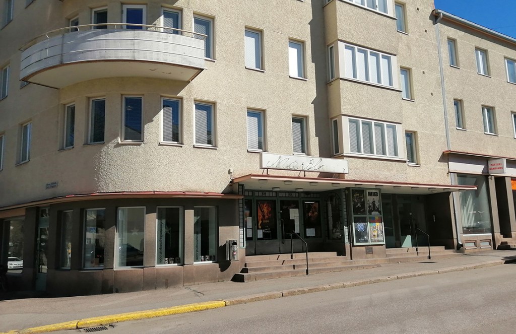 Ingången till biografen Kino Marilyn i Lovisa. Bilden är tagen en tidig vår, tror jag. Och kanske jag har visat den förr? Gillar huset, arkitekturen. Här finns förstås även annat än bara en bio, bland annat en frissa, bostäder, begravningsbyrå med mera.