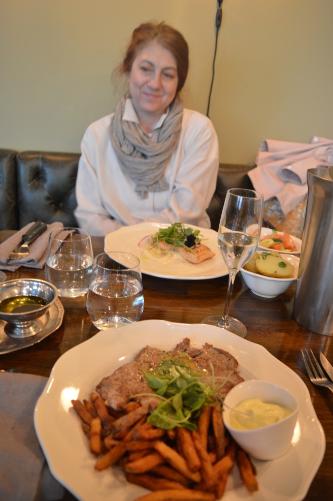 Dimi äter lax och jag favoriten Eero Laaksos biff på Osteria Locale i Lovisa.
