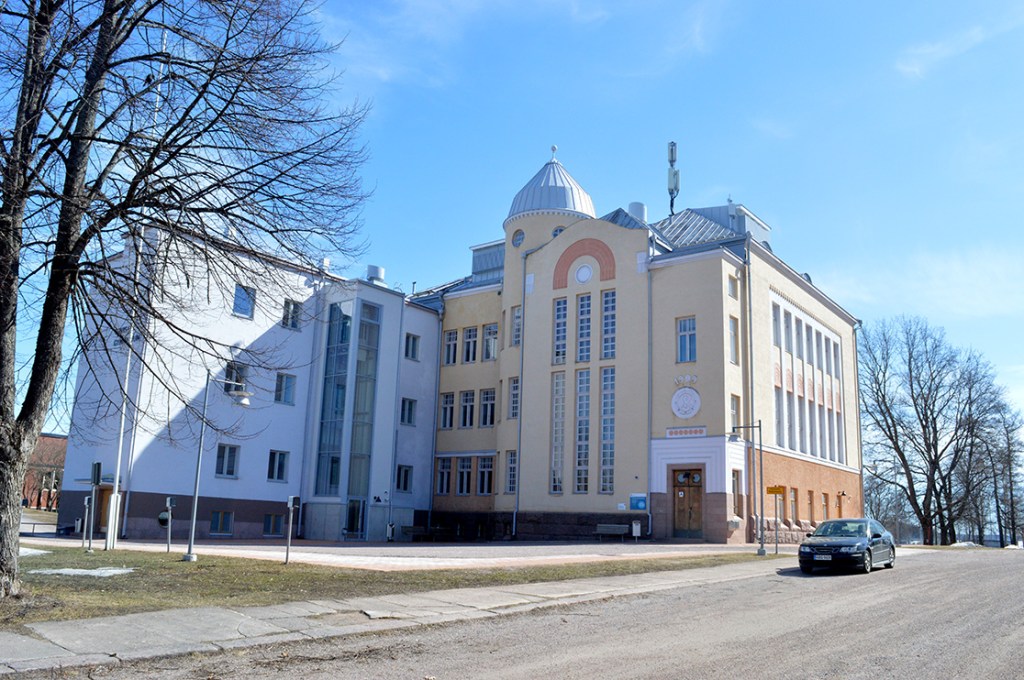 Utsikten från tredje våningens flygel ser ut så här. Med en del egnahemshus i förgrunden och sedan medborgarinstitutets hus med det bruna sluttande taket och röda, träbyggnaden på gården. Hotell och restaurang Zilton är den smutsgula byggnaden och längst borta kyrkan med det tämligen nya taket. Blandad arkitektur minsann.