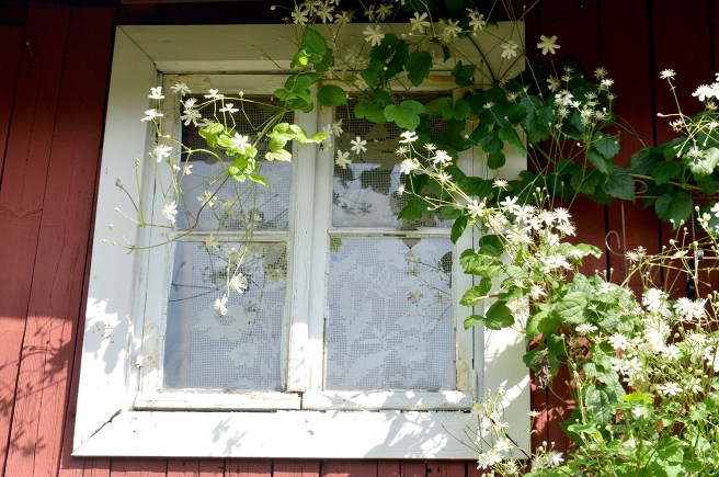 När jag steg in genom dörren från ett annat rum till det här kändes det nästan magiskt. Ljuset är fantastiskt och fönstren saknar gardiner, helt i min stil således.En del av huset och en liten del av gården, och en lite speciell hängmatta 🙂Solljuset fick det att glittra i gräset som om där legat diamanter, men det syns inte på bilden.På gården finns ett modernt lusthus i glas.Glasbuteljer och några strån från naturen, kan det bli enklare och vackrare?Här får någon sova, intill en eldstad.En gammal härlig spis. Intill den fanns en modernare variant.Verandan. Kolla väggarna, pärlsponten, taket, de varierande fönsterglasen, pelargonerna och den gamla soffan ❤