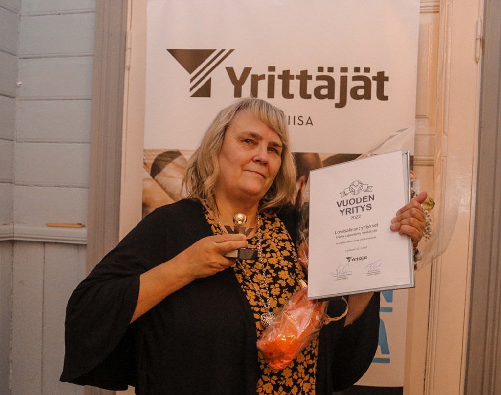 Jag har fått många gratulationer via Facebook, men till saken hör – och det nämnde jag även i inlägget där – att Årets Företagare är Loviisalaiset Yritykset, alltså alla företag i Lovisa som är medlemmar i föreningen Lovisa Företagare. Under Loviisalaiset Yritykset står det Carita Liljendahls mediabyrå. Det är mitt företag, som i år fyllde sex år. Jag har sedan sommaren 2016 sålt olika tjänster i form av artiklar, fotografier, översättningar m.m. till andra företag och till föreningar. Nu säljer jag i huvudsak mina tjänster till Understödsföreningen för Nya Östis.