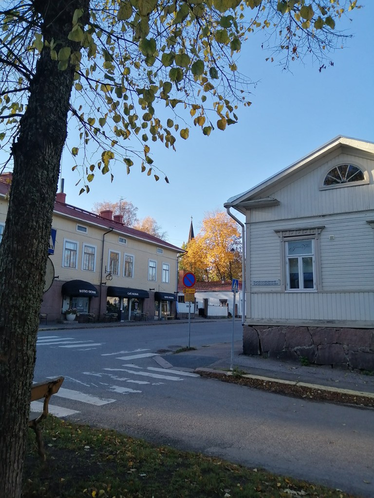 Alexandersgatan, sedd från söder mot norr. Till vänster ligger Bistro Kronan, ett café och matställe. Här fanns Vaherkyläs café och bageri för ett antal år sedan. Västra sidan, och på bilden vänstra sidan, av gatan har hållits rätt intakt med gamla byggnader såvitt jag vet.