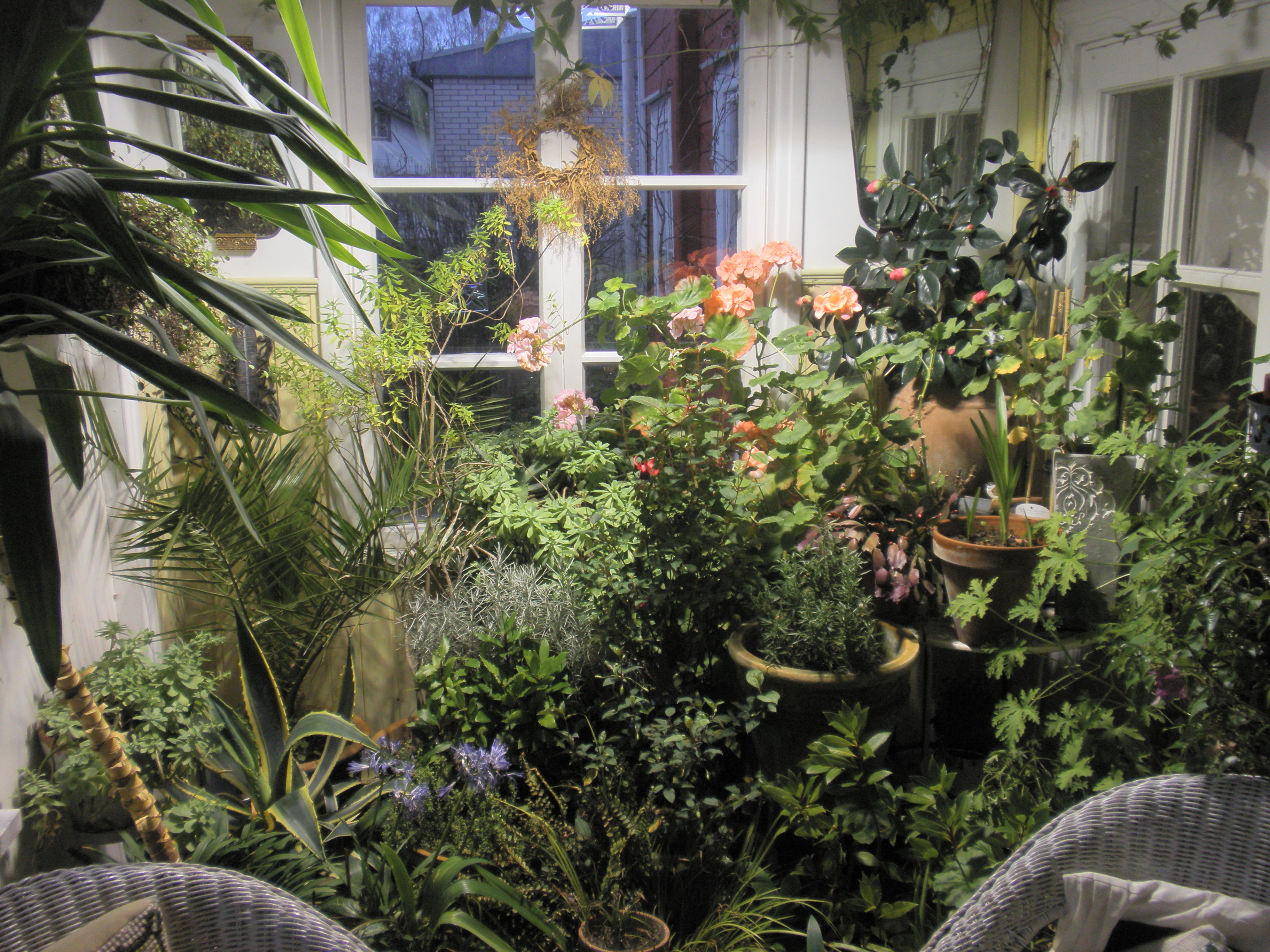 2. Härlig vinterträdgård inomhus på verandan i Konungsdammens hus hos Olga Isaeva och Markku Pulkkinen