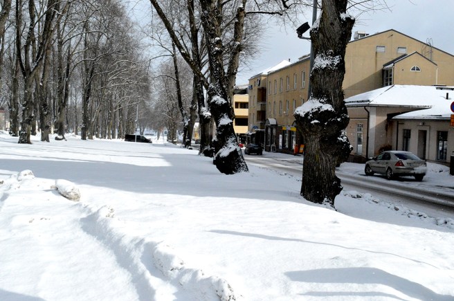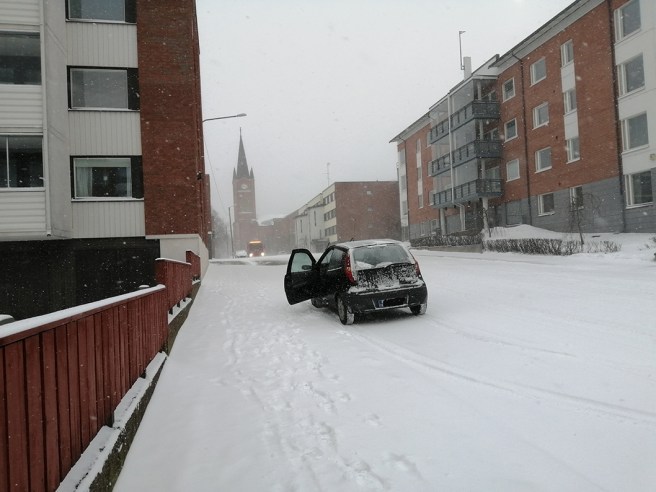 I natt kom det tio centimeter snö och var minusgrader. I morse regnade det och som bäst har det varit +5 grader, men jämngrått hela dagen. Extremt halt på många ställen.
