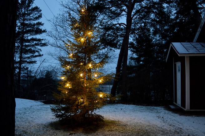 Jag tycker att den är fin, då man ser den utifrån gatan i kvällens mörker. Dessutom tycker jag att tomten och halmbockarna också ser roliga ut, de spelar sina roller bra i sammanhanget!
