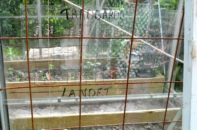 Eftersom familjens barn är intresserade av vad som växer i odlingslådorna har deras mamma gjort en karta över det som finns i dem. Det här var lite svårfotograferat, men kollar ni riktigt noga ser ni var potatisen växer, rödbetan, chilin, morötterna osv.