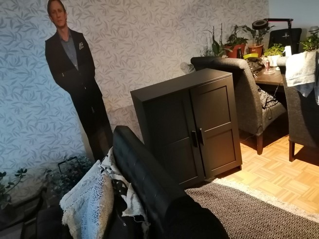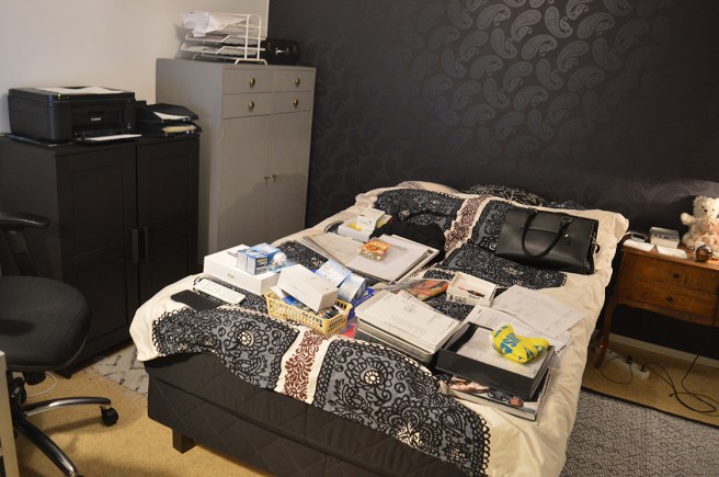Här är ju absolut allt inte klart än. Min vision är att skapa något slag av hyllor, kanske i fönstret. Sådana som man hänger upp finns rentav att köpa. Men jag har inte bråttom med det, och även om mitt sinne stressas av det kaos som olika små lådor fulla med saker utgör, jobbar jag på att vara barmhärtig mot mig själv. I vardagen ska det finnas olika små glädjeämnen. Allt får inte handla om att skapa ordning, även om det är det jag slutligen behöver och vill ha.