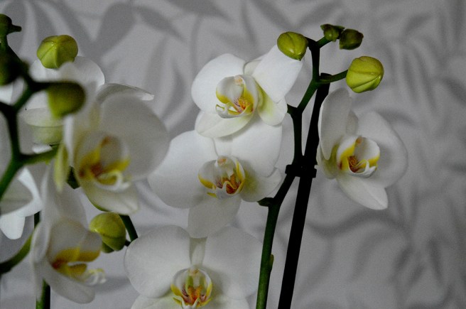 Orkidén som jag fick av grannen Pia innan jag for på läsarresan står sig fortfarande såhär fin. Förr har jag inte fått orkidéer att behålla blommorna såhär länge. Jag tror den trivs för att jag har så svalt inne 🙂