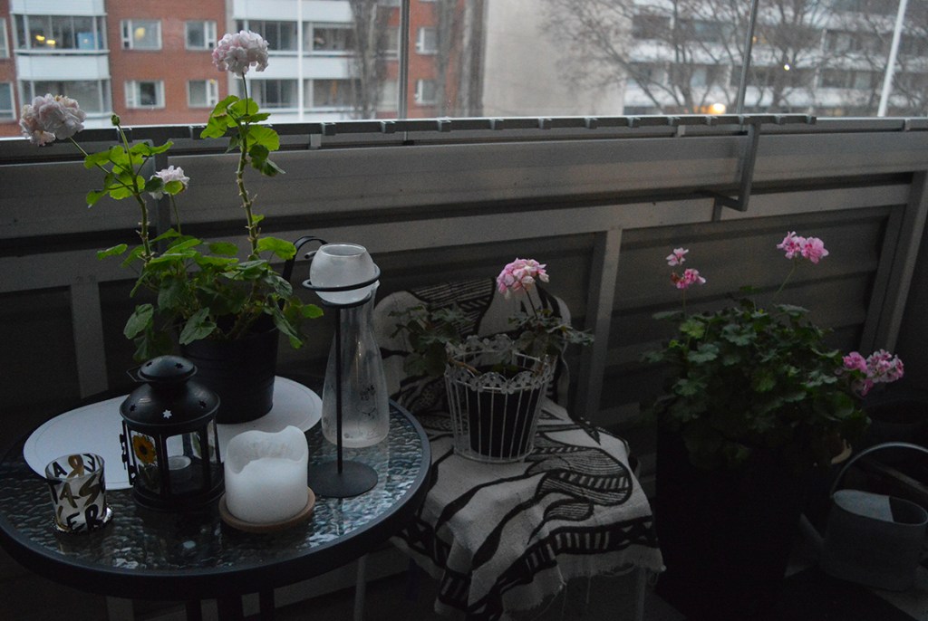 Hade inga andra foton att ta till, så jag öppnade balkongdörren och förevigade pelargonerna som står sig fina fortfarande. Den 18 november!