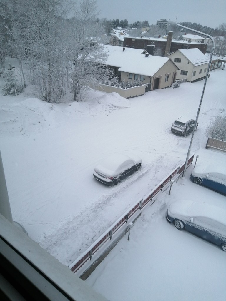 Vaknade till denna syn. Den som tycker om snö och vill ha mera av den vita varan i skog och mark för att kunna åka skidor, den personen blev glad i dag. Själv har jag inställningen att det inte går att styra vädret, det måste tas som det kommer.
