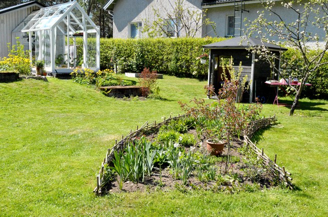En sådan där riktigt liten bit är det inte frågan om, förstås 🙂 Och mycket fint har ägarna fått till stånd, allt från odlingslådor till formade rabatter. Ett litet växthus finns, en lekstuga och en annan liten stuga med bastu och försäljningsbod.