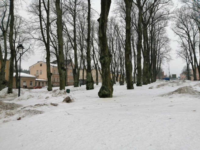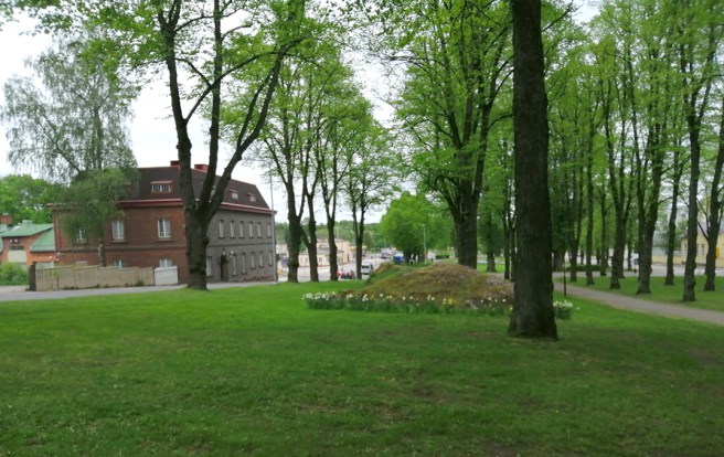 Parken intill kyrkan. Så grön och fin fortfarande och vackra luktärter som klättrat längs ställningen.