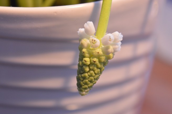 Blommor är ett av många Guds SMÅ underverk. Och den här pärlhyacintens ena blomstängel, som böjde sig mer än de andra, har många många riktigt SMÅ blommor.